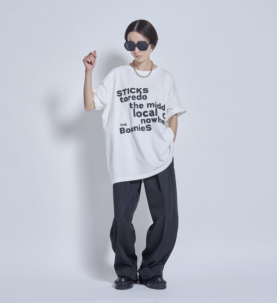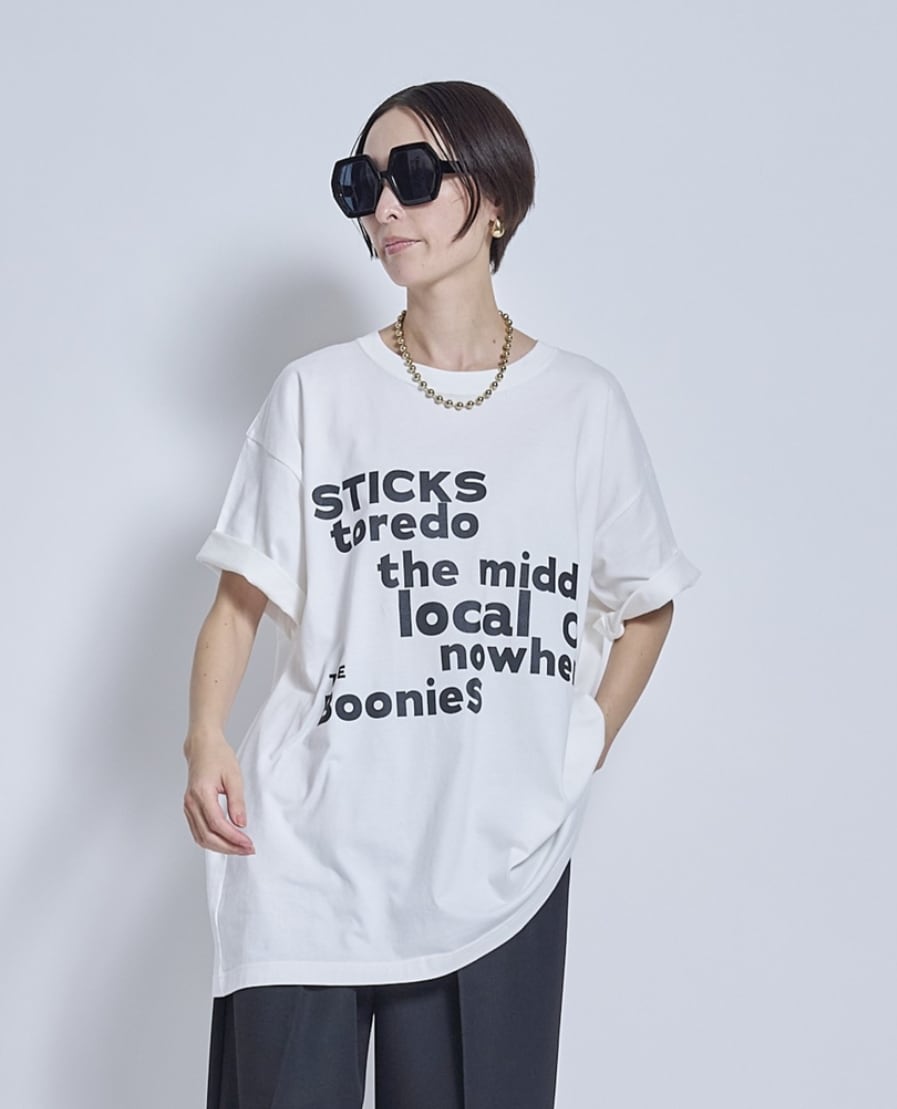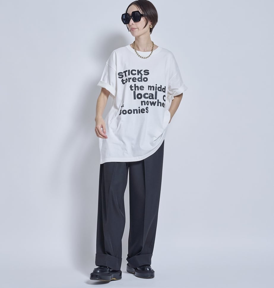これまでにも大量の販売を行っている定番ビッグTシャツ。メンズのXLくらいのサイズ感で、180cmくらいの男性まで着ることができます。もちろん女性に大人気で、ずっと変わらず出しています。真夏のこのシーズンの展示会では毎年1000点以上のロゴTを販売していますが、リピーターがとても多いです。コットン100%のしっとりした肌触りです。しっかりしていて、長く愛用できて首周りの経年劣化が少ないです。
